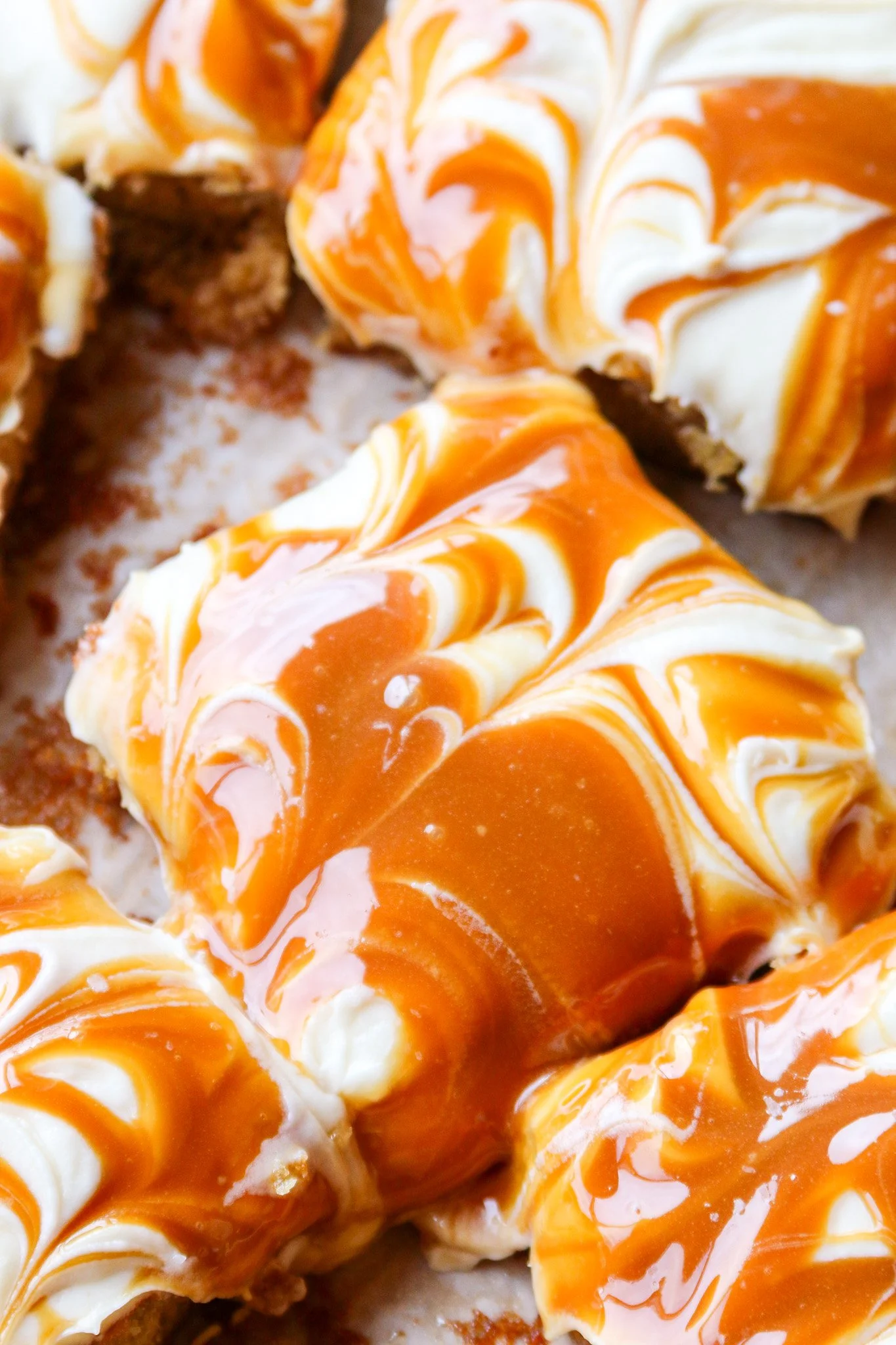 - Once the cake is fully cooled, spread the cream cheese frosting evenly over the top. Drizzle the salted caramel sauce over the frosting. Use a knife or toothpick to swirl it into the frosting for a marbled effect, or leave it as a drizzle. Sprinkle a little salt over the cake, if desired. Slice and serve. Store any leftovers in an airtight container in the refrigerator for up to 5 days.