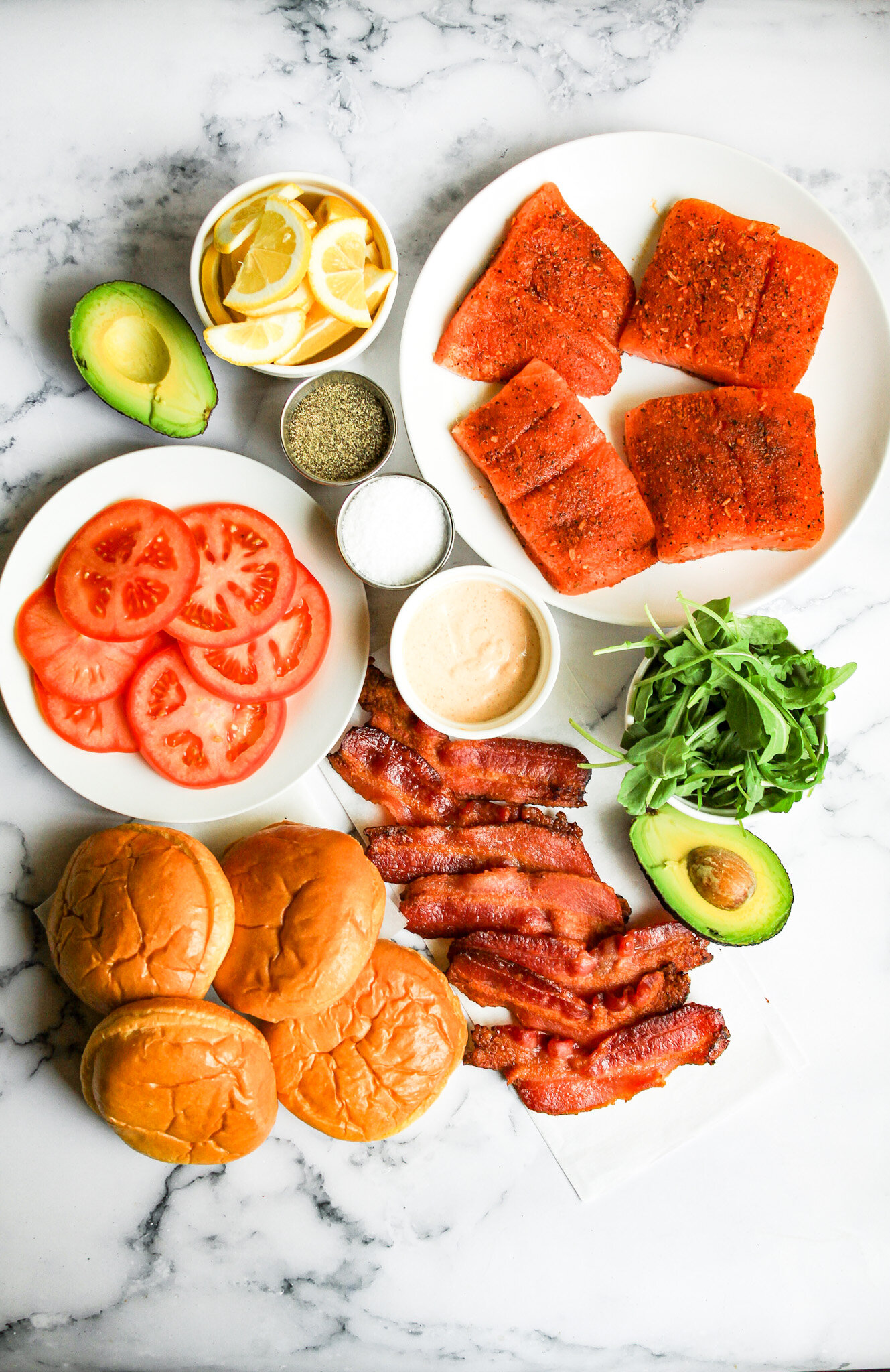 Step 7: Assemble the Sandwiches & Serve. Begin assembling your sandwiches. Add your spicy mayo to both halves of the bun. Remove salmon from the oven. Add your arugula, tomato slices, avocado slices, salmon fillets, and bacon strips (in that order). Top with the other half of the bun and enjoy!